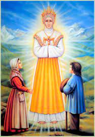 Melanie saw a beautiful light shining more beautifully than the sun with Maximin by her side they more closer and they saw, In the dazzling light a woman seated on a large stone, her elbows resting on her knees and her face buried in her hands, she was bent over as if her sorrows were too heavy to bear. She wore a headdress topped by a lucent crown with a band of roses, a dress with beams of light, and slippers edged with roses. Around her neck hung a golden crucifix: on one end of the cross beam was a hammer and nails, and on the other, a pincher. Over her shoulders was a heavy chain.